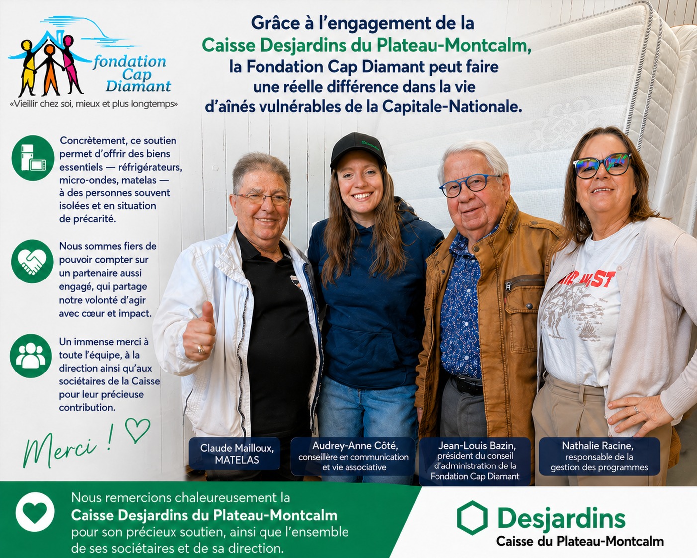 Comme on le dit, vieillir fait aussi partie de la vie! Merci à la Fondation Cap Diamant de me permettre de le faire si bien! Merci à toutes les donatrices et donateurs qui ont à coeur le maintien à domicile des aînés!