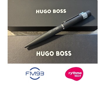 Un stylo Hugo Boss de qualité de couleur noire sur lequel est inscrit FM-93 et Rythne-FM 102,9. Il est rangé dans un coffret noir HUGO BOSS.